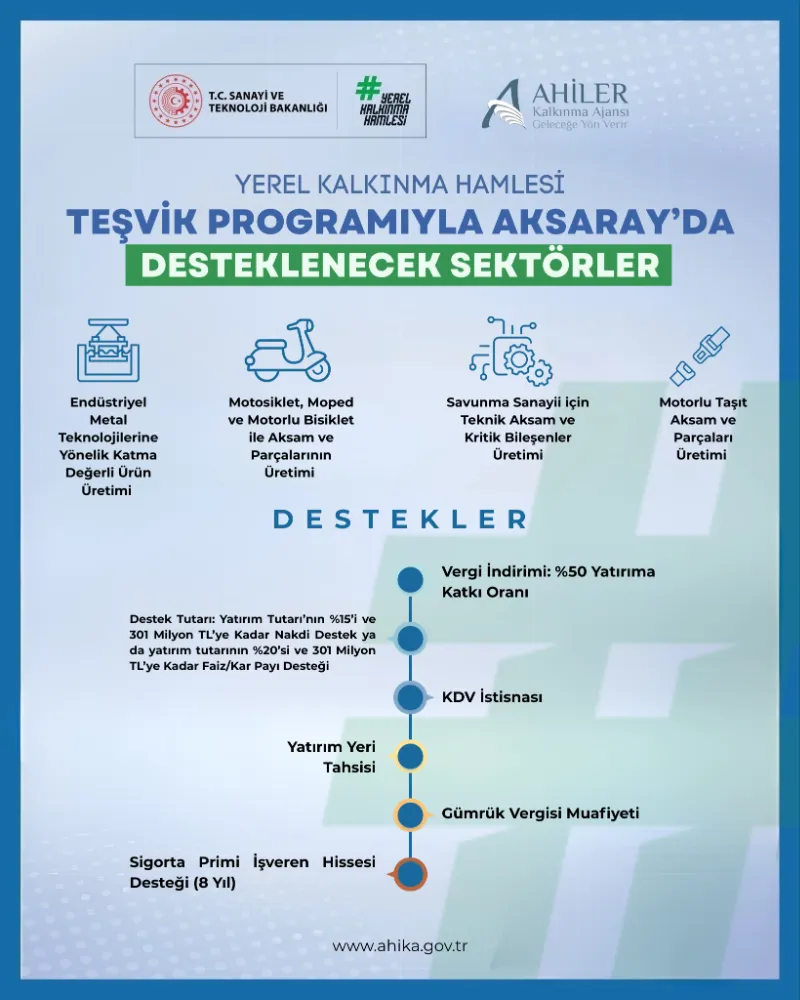Bu çerçevede, Ahiler Kalkınma Ajansı’nın faaliyet gösterdiği TR71 Bölgesi illerinden Aksaray için 2026 yılı Yerel Kalkınma Hamlesi Teşvik Programı kapsamında öncelikli yatırım konuları belirlenmiştir.