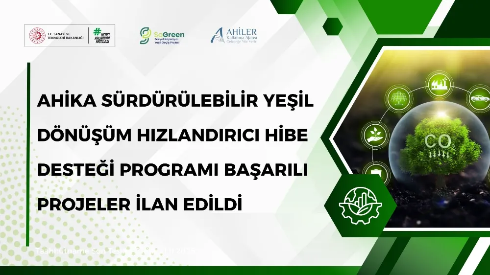 Ahiler Kalkınma Ajansı tarafından 15 Eylül 2025 tarihinde ilan edilen 2025 Yılı Sürdürülebilir Yeşil Dönüşüm Hızlandırıcı Hibe Desteği Programı kapsamında yürütülen değerlendirme süreci tamamlandı. Yapılan teknik ve mali değerlendirmelerin ardından destek almaya hak kazanan projeler belirlenerek kamuoyuna duyuruldu.