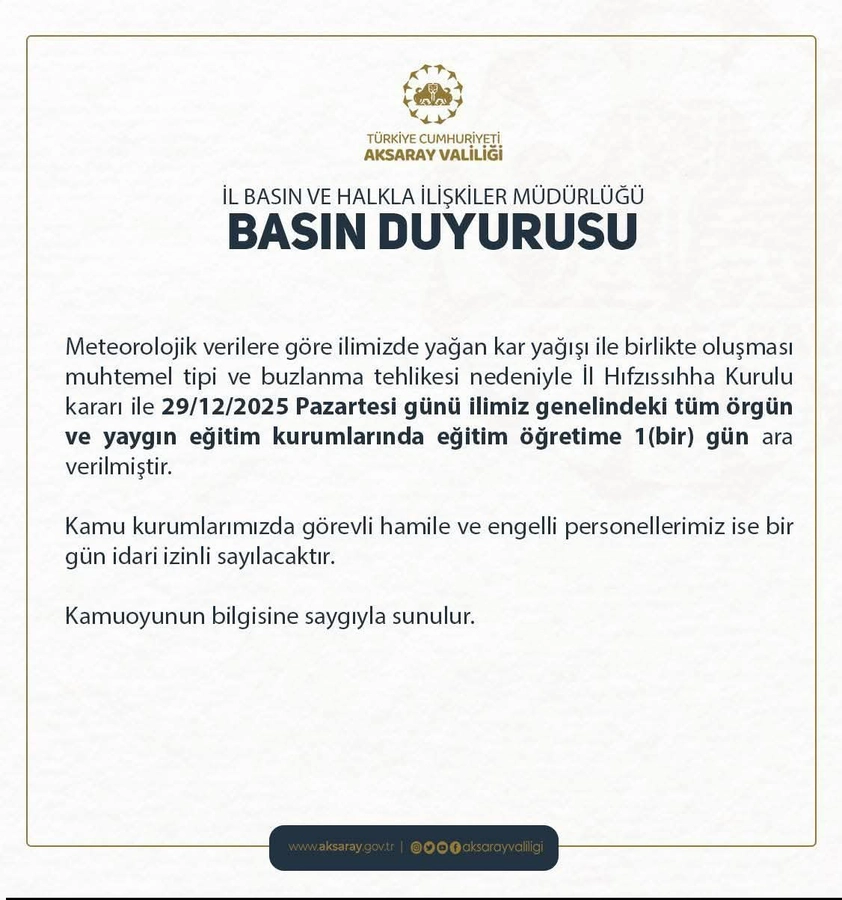 Aksaray Valiliği, meteorolojik verilere göre kentte etkisini sürdüren kar yağışı ve beraberinde oluşabilecek tipi ile buzlanma riskine karşı tedbir amaçlı önemli bir karar aldı. İl Hıfzıssıhha Kurulu kararıyla 29 Aralık 2025 Pazartesi günü il genelindeki tüm örgün ve yaygın eğitim kurumlarında eğitime 1 gün ara verildi.