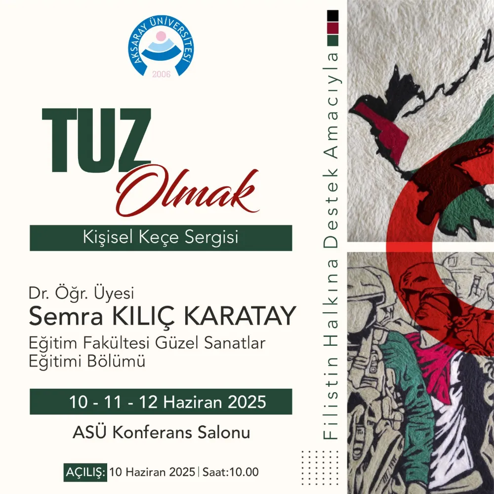 Aksaray Üniversitesi (ASÜ) Eğitim Fakültesi Güzel Sanatlar Eğitimi Bölümü öğretim üyelerinden Dr. Öğr. Üyesi Semra Kılıç Karatay’ın hazırladığı “Tuz Olmak” adlı kişisel keçe sergisi, 10-11-12 Haziran 2025 tarihlerinde ASÜ Merkezi Konferans Salonu’nda sanatseverlerin ziyaretine açılacak.