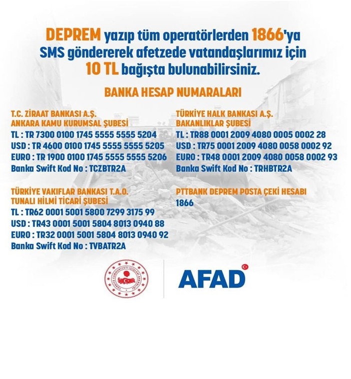 Aşağıda yardımların gönderileceği hesapları bilgilerinize sunuyorum;