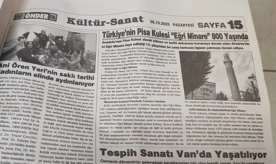 Gazetecilik mesleğinin verdiği alışkanlıkla, bulunduğum her şehirde yerel basına göz atarım. Osmaniye’de de Önder Gazetesi’ni incelerken, sayfaların arasında Aksaray’ı görmek beni fazlasıyla duygulandırdı. Gazetenin geniş bir bölümünde, Aksaray’ın simgelerinden Eğri Minare’yi konu alan kültür haberine yer verilmişti.